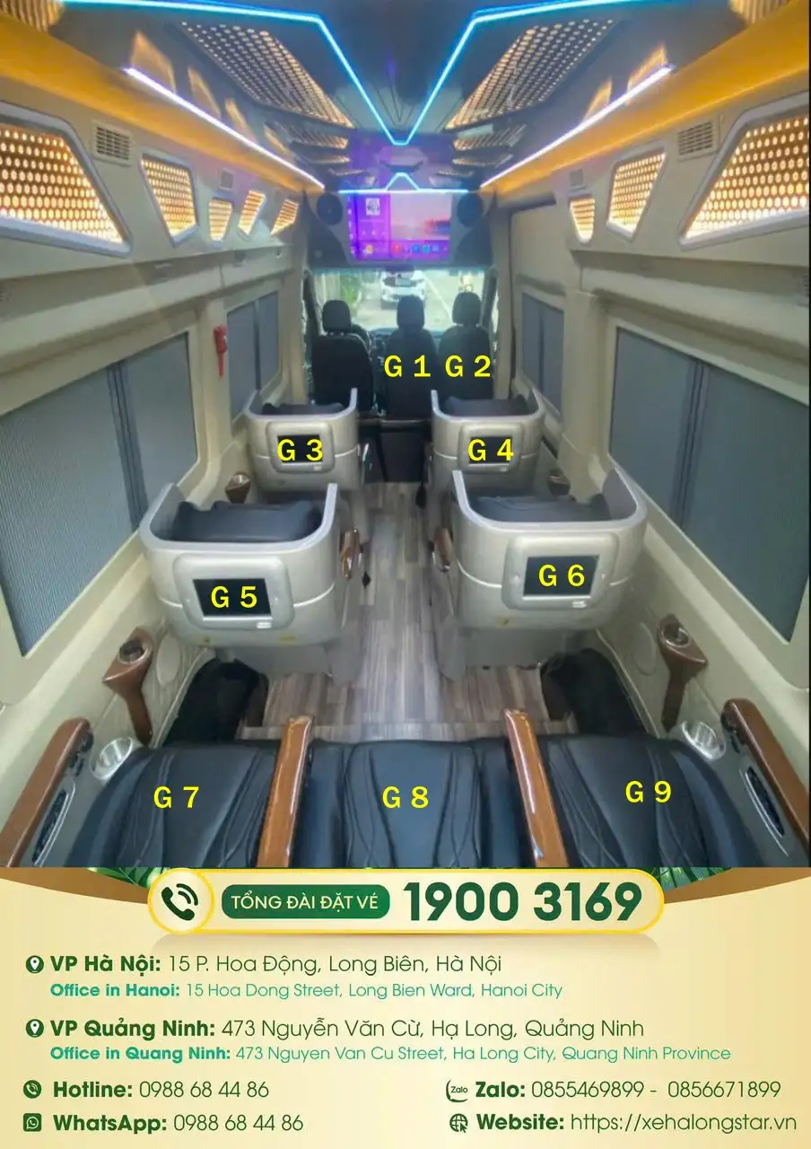 💺 Chọn ghếGhế đầu: 2 ghế G1,G2 ( 280k )Ghế giữa: 4 ghế G3,G4,G5,G6 ( 330k )Ghế cuối: 3 ghế G7,G8,G9 ( 300k )